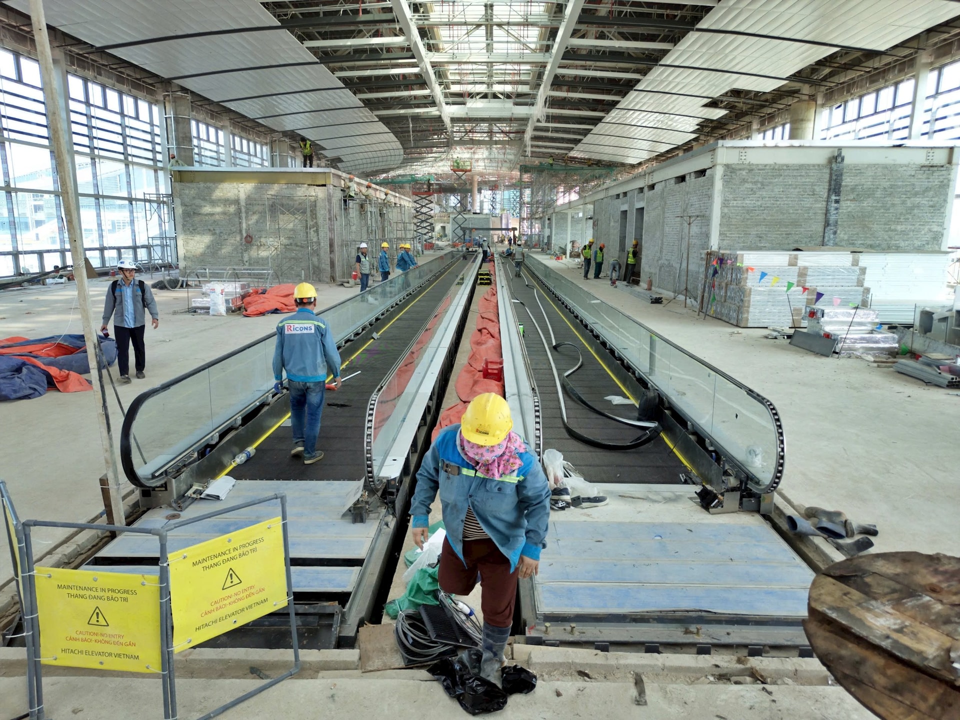 Song song, cầu ống lồng cố định kết nối giữa nhà ga và sân đỗ máy bay đã hoàn thiện khung thép, đang tiến hành lắp kính. Theo thiết kế, sân bay có 32 cầu ống lồng, bố trí 40 vị trí đỗ gần cho các loại tàu bay Code C, E và F.